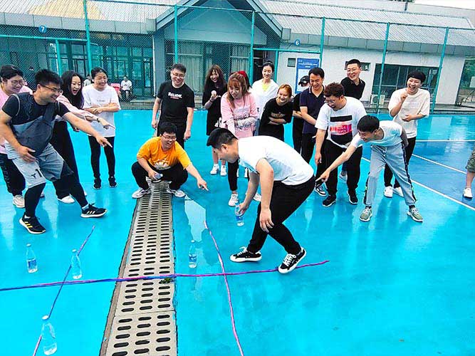 大家一排站好,從左到右,每人的右腿與另一人的左腿依次并齊,并用扁帶繩子系上,繩子綁的位置是腳踝以上部分。聽(tīng)見(jiàn)哨聲即為游戲開(kāi)始,從起點(diǎn)到終點(diǎn),按用時(shí)由短到長(zhǎng),取前五名依次加分。